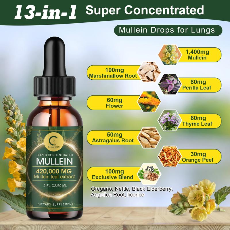 This super-concentrated mullein leaf formula combines 13 carefully selected botanicals—including mullein, marshmallow root, perilla, thyme, astragalus, and elderberry—to support clear breathing, throat comfort, and overall respiratory wellness. Alcohol-free and easy to take, each serving delivers high-potency plant extracts designed for daily lung and immune support, all in one simple dropper.